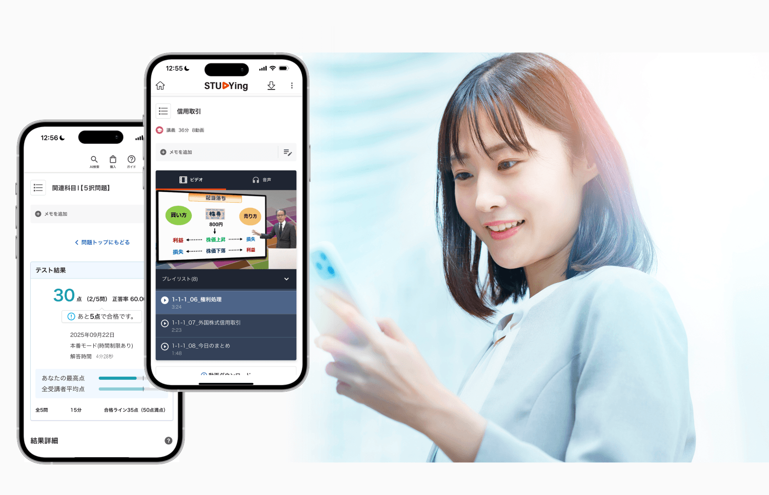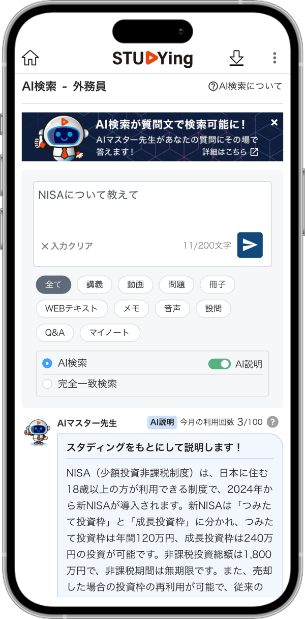 スマート問題集スマート問題集は、基本講座で学んだ内容を確実に覚えるためのオンライン問題集です。通勤時間などのスキマ時間で問題演習を行いながら、重要なポイントを確実に覚えることができます。 問題の内容は、本試験の過去問を分析し、本試験の問題を解く上で必須の知識について重点的に出題しています。また、問題を解いた後に、わかりやすい解説を読むことで効率よく試験に合格するための基礎知識を吸収できるように作られています。 スタディングの問題練習では、問題を解くたびにスタディングマイページに成績が記録されます。さらに、間違った問題だけ後でまとめて解くなどの機能もあるため、効率的に実力アップを行えます。 | |